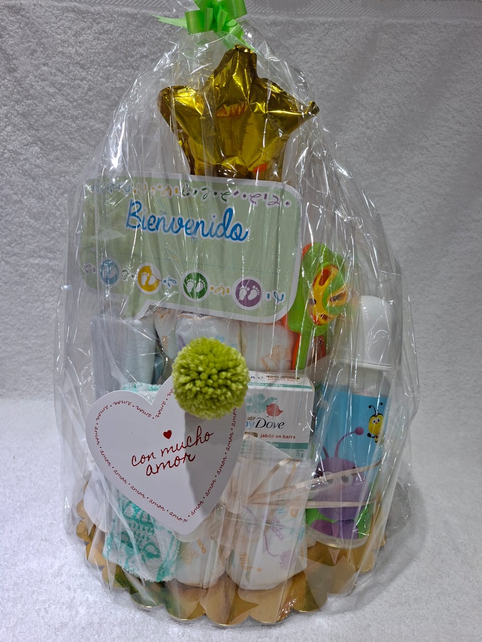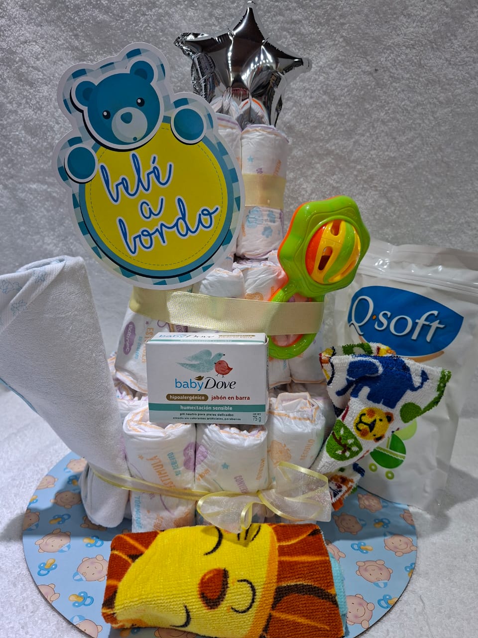 Da la bienvenida al nuevo miembro de la familia con nuestra encantadora Torta de Pañales. Este regalo, meticulosamente ensamblado, no solo es un detalle visualmente atractivo, sino también increíblemente práctico, repleto de artículos esenciales que los nuevos padres apreciarán. Es la combinación perfecta de ternura y utilidad para celebrar un nacimiento, fiesta de Revelacion de sexo o un baby shower.